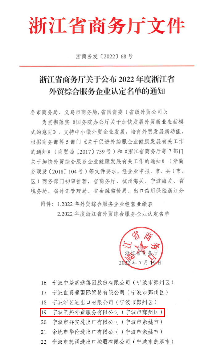 2022.07.207月19日,浙江省商务厅公布2022年度浙江省外贸综合服务企业认定名单,集团旗下宁波凯邦外贸服务榜上有名。2022年度浙江省外贸综合服务企业...
